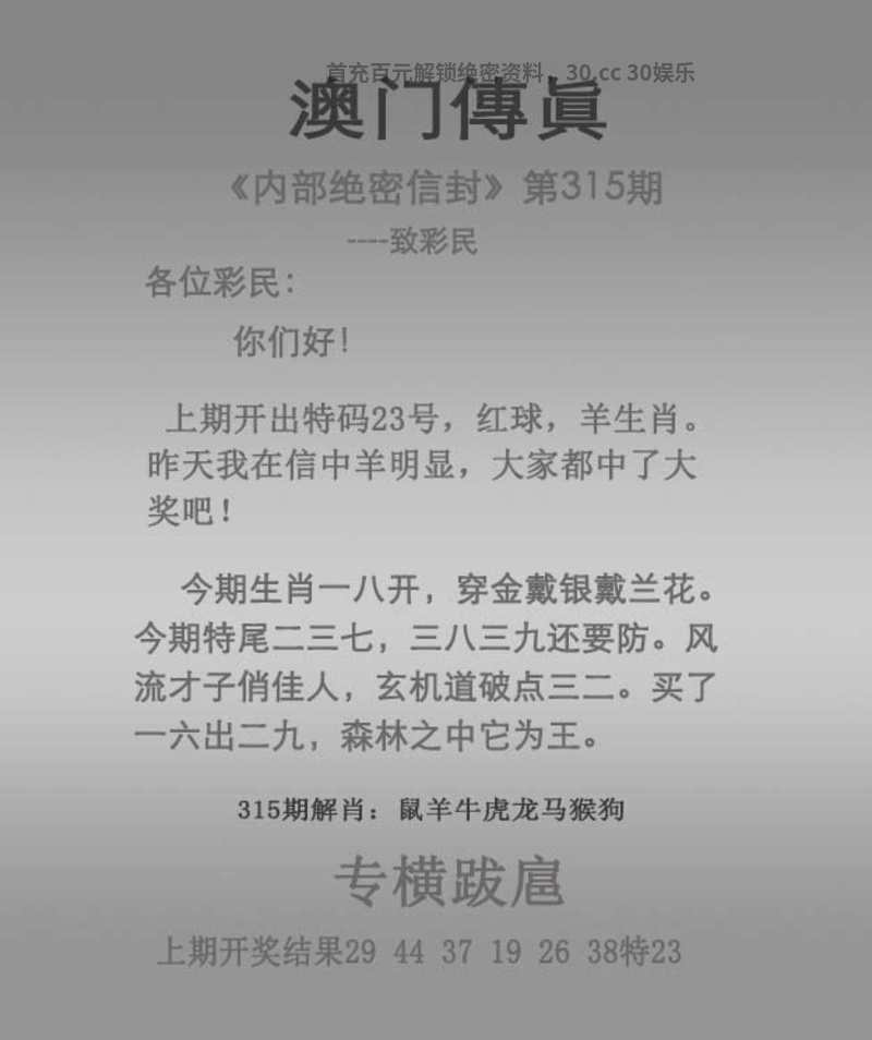 传真315期 今期生肖一八开,穿金戴银戴兰花。 今期特尾二三七,三八三九还要防。 风流才子俏佳人,玄机道破点三二。 买了一六出二九,森林之中它为王。 专横跋扈 解:今期穿金戴银戴兰花,解吉美生肖兔龙蛇马羊鸡,森林之中它为王,解野兽生肖蛇虎兔龙鼠猴。 拐特生肖:龙虎兔狗牛马猴羊猪 主特:26.38.16.28.15.27.20.32.17.29.24.36 |